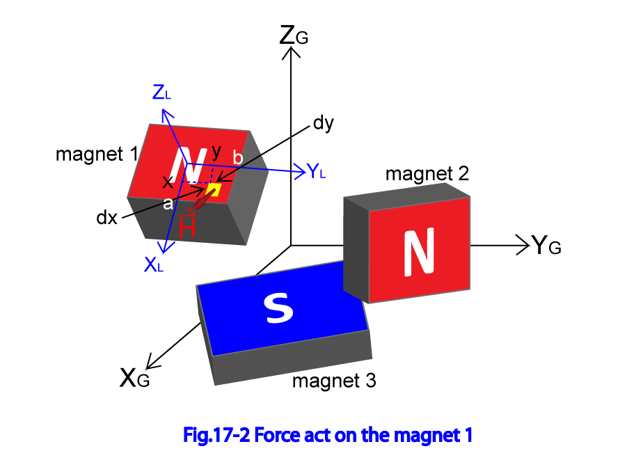 この場合磁石1に働く力を計算するものとする。この場合、磁石1に働く力は、Fig.17-2に黄色で示された磁石1のN極の磁極面の微小領域(dx, dy )に働く力のN極面とS極面の総和で表すことができる。 磁石1の磁荷の面密度を としローカル座標系のN極面 における磁界を S極面 における磁界を と表すと